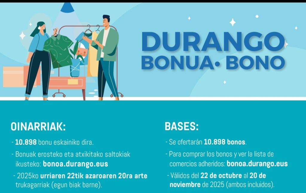 Durango, en colaboración con la asociación Dendak Bai, ha puesto en marcha una nueva edición de la campaña de bonos de comercio, una iniciativa destinada a fomentar la economía local y a reforzar el tejido comercial del municipio. La campaña se desarrollará del 22 de octubre al 20 de noviembre de 2025, ambos días incluidos.