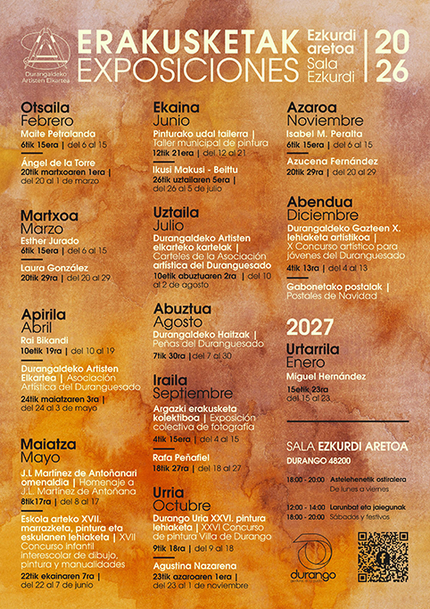 Ya tiene calendario anual. La Asociación Artística del Duranguesado, gestora de la Sala Ezkurdi, ha hecho públicas sus fechas de exposiciones que marcarán parte del ritmo cultural de la villa durante el próximo año. Este programa, comprende el periodo anual entre asambleas, extendiéndose por ello desde este febrero hasta enero de 2027. La programación de este año, que arranca este viernes 6 de febrero, destaca por su pluralidad. Destacar cuatro exposiciones de cuatro nuevas socias: Maite Petralanda (febrero), Esther Jurado (marzo), Laura González (marzo) y Agustina Nazarena (octubre).