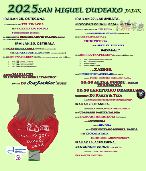 Este fin de semana toca el turno a las fiestas de San Miguel de Dudea, en Amorebieya-Etxano, que despedirá el mes de septiembre con ambiente. Del jueves 25 al lunes 29, el barrio vivirá cinco días repletos de actividades dirigidas a niñas y niños, jóvenes y personas adultas.