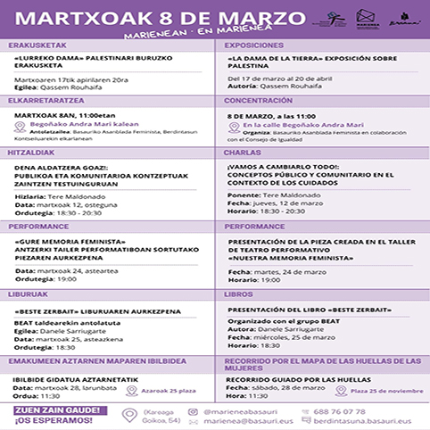 Con motivo del 8 de marzo, Día Internacional de las Mujeres, Marienea de Basauri propone una programación especial durante el mes de marzo. «En ella, traemos varias propuestas en diferentes formatos: exposiciones, charlas, presentaciones de libros…», especifican.